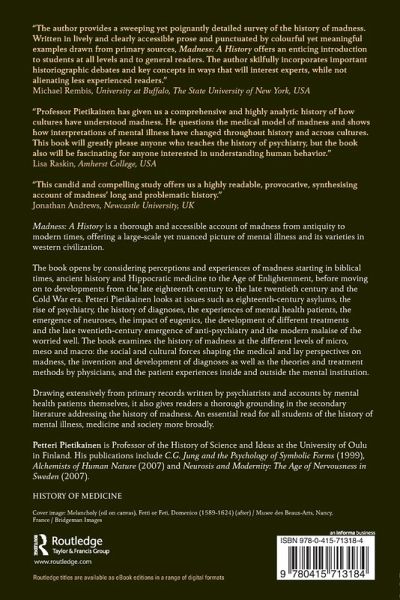 "This candid, ambitious and compelling study offers us a highly readable, provocative, synthetisising account of madness' long and problematic history. Taking us from the Medieaval landscape of folly and demonic possession, through early modern and Enlightenment views and treatments of madness, to the birth of the asylum and the modern ages of psychopharmacology, anti-psychiatry and social care, this is as much a history of problematics in how madness was and is managed as of advances in how it was and is perceived. Seeking to situate rather than to anatomoise or pathographise madness, Pietikäinen phenomenologically elucidates how madness manifests itself or 'makes itself visible' in different contextual and temporal settings. He tells us tales less of progress than of unfulfilled hopes, less of mental illness and evolving diagnostic clarity than of the problems in constructions of being in terms of dependence and vulnerability, less of the commonalities in madness' manifesting than the manifold varieties of mental distress, wellness and being."