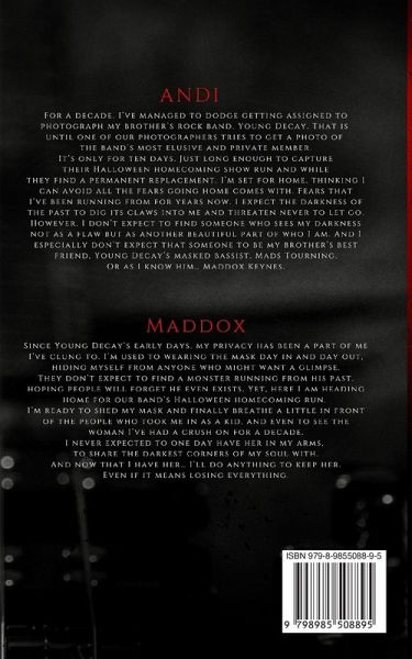 ANDI For a decade, I've managed to dodge getting assigned to photograph my brother's rock band, Young Decay. That is until one of our photographers tries to get a photo of the band's most elusive and private member. It's only for ten days. Just long enough to capture their Halloween homecoming show run and while they find a permanent replacement. I'm set for home, thinking I can avoid all the fears going home comes with. Fears that I've been running from for years now. I expect the darkness of the past to dig its claws into me and threaten never to let go. However, I don't expect to find someone who sees my darkness not as a flaw but as another beautiful part of who I am. And I especially don't expect that someone to be my brother's best friend, Young Decay's masked bassist, Mads Tourning. Or as I know him... Maddox Keynes MADDOX Since Young Decay's early days, my privacy has been a part of me I've clung to. I'm used to wearing the mask day in and day out, hiding myself from anyone who might want a glimpse. They don't expect to find a monster running from his past, hoping people will forget he even exists. Yet, here I am heading home for our band's Halloween homecoming run. I'm ready to shed my mask and finally breathe a little in front of the people who took me in as a kid, and even to see the woman I've had a crush on for a decade. I never expected to one day have her in my arms, to share the darkest corners of my soul with. And now that I have her... I'll do anything to keep her. Even if it means losing everything.