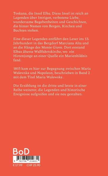 Toskana, die Insel Elba. Diese Insel ist reich an Legenden über Intrigen, verbotene Liebe, wundersame Begebenheiten und Geschichten, die hinter Namen von Bergen, Kirchen und Buchten stehen. Eine dieser Legenden entführt den Leser ins 13. Jahrhundert und auf die Insel Elba, in das Bergdorf Marciana Alta und an die Hänge des Monte Giove. Dort enstand Elbas älteste Wallfahrtskirche, wo der Legende nach ein Hirtenjunge an einer Quelle ein Marienbildnis fand. 1815 kam es hier zur Begegnung zwischen Maria Walewska und Napoleon, beschrieben in Band 2 - Maria Walewska - derselben Reihe. Die Erzählung ist die dritte und letzte in einer Reihe weiterer, die Legenden und historische Ereignisse aufgreifen und sie neu gestalten.
