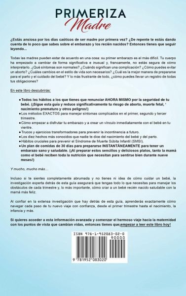 ¿Estás ansiosa por los días caóticos de ser madre por primera vez? ¿De repente te estás dando cuenta de lo poco que sabes sobre el embarazo y los recién nacidos? Entonces tienes que seguir leyendo... Todas las madres pueden estar de acuerdo en una cosa: su primer embarazo es el más difícil. Tu cuerpo ha empezado a cambiar de forma significativa e inusual y, francamente, no estás segura de cómo interpretarlo. ¿Qué síntomas son normales? ¿Cuándo significan una complicación? ¿Cómo puedes evitar un aborto? ¿Cuáles cambios en el estilo de vida son necesarios? ¿Cuál es la mejor manera de prepararse para el parto y el cuidado del bebé? Y lo más frustrante de todo, ¿cómo puedes llevar un registro de todas tus obligaciones? En este libro descubrirás: Todos los hábitos a los que tienes que renunciar AHORA MISMO por la seguridad de tu bebé. (¡Sigue esta guía y reduce significativamente tu riesgo de aborto, muerte fetal, nacimiento prematuro y otros peligros!) Los métodos EXACTOS para manejar síntomas complicados en el primer, segundo y tercer trimestre. Cómo empezar a disfrutar tu embarazo y a crear un vínculo inmediatamente con el bebé en tu vientre. Trucos y ejercicios transformadores para prevenir la incontinencia a futuro. Los diez hechos más conocidos que nadie te dice del nacimiento del bebé y del parto. Hábitos cruciales para prevenir el Síndrome de Muerte Súbita Infantil (SMSI). Un plan de comidas de 30 días para prepararse INSTANTÁNEAMENTE para tener un embarazo sano y saludable. (¡Al preparar estos sencillos y deliciosos platos, tanto la mamá como el bebé reciben toda la nutrición que necesitan para sentirse bien durante nueve meses!) Y mucho, mucho más… Incluso si te sientes completamente abrumada y no tienes ni idea de cómo cuidar un bebé, la investigación experta detrás de esta guía asegurará que tengas todo lo que necesitas para manejar los obstáculos de cada trimestre y, lo más importante, cómo criar a un bebé recién nacido saludable con la mamá más feliz. Al confiar en la extensa investigación que hay detrás de esta guía, aprenderás exactamente cómo navegar cada paso de tu nuevo viaje con confianza, desde el primer trimestre hasta el nacimiento, la infancia y más. Si quieres acceder a esta información avanzada y comenzar el hermoso viaje hacia la maternidad con los puntos de vista que cambian vidas, entonces tienes que¡empezar a leer este libro hoy!