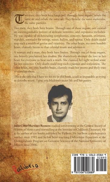 Two men, they both have lungs and, through those organs, inhale the same air and exhale the same air. They breathe the same molecules, the same particles. Two men, they both have brains. Through one of those organs, one created an inextinguishable torrent of delicate, sensitive, and expressive melodies. He was capable of orchestrating symphonies, concerts, fantasies, overtures, marches, serenades for strings, suites, ballets, and operas. Only death could stop such a wealth of genius and creativity. The other brain, my own humble brain, clumsily listens to that celestial music and admires it. A woman and a man, they both have brains. Through one of those organs, one bravely proclaimed her doubts. She shamelessly shouted the love in her heart for everyone to hear such a truth. She claimed her right to find sense for her existence. Only death could stop such a passion and restlessness. The other brain, my own humble brain, clumsily reads her poems and shyly tries to translate them. This is the task that I have set for me in this book, a task as impossible as trying to describe music. I give you Madrina’s secret life and her poetry.
