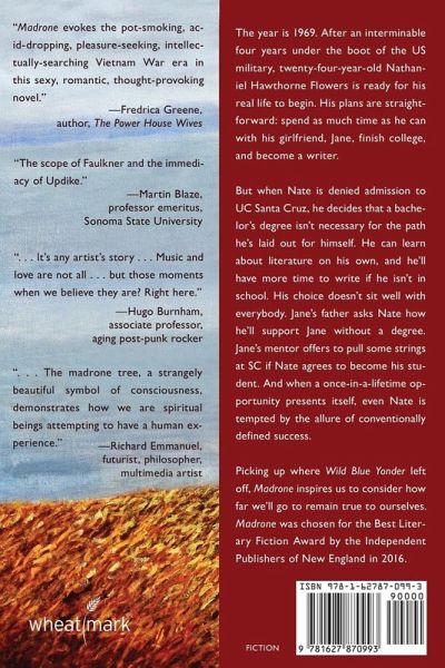 The year is 1969. After an interminable four years under the boot of the US military, twenty-four-year-old Nathaniel Hawthorne Flowers is ready for his real life to begin. His plans are straightforward: spend as much time as he can with his girlfriend, Jane, finish college, and become a writer. But when Nate is denied admission to UC Santa Cruz, he decides that a bachelor's degree isn't necessary for the path he's laid out for himself. He can learn about literature on his own, and he'll have more time to write if he isn't in school. His choice doesn't sit well with everybody. Jane's father asks Nate how he'll support Jane without a degree. Jane's mentor offers to pull some strings at SC if Nate agrees to become his student. And when a once-in-a-lifetime opportunity presents itself, even Nate is tempted by the allure of conventionally defined success. Picking up where Wild Blue Yonder left off, Madrone inspires us to consider how far we'll go to remain true to ourselves. Madrone was chosen for the Best Literary Fiction Award by the Independent Publishers of New England in 2016.