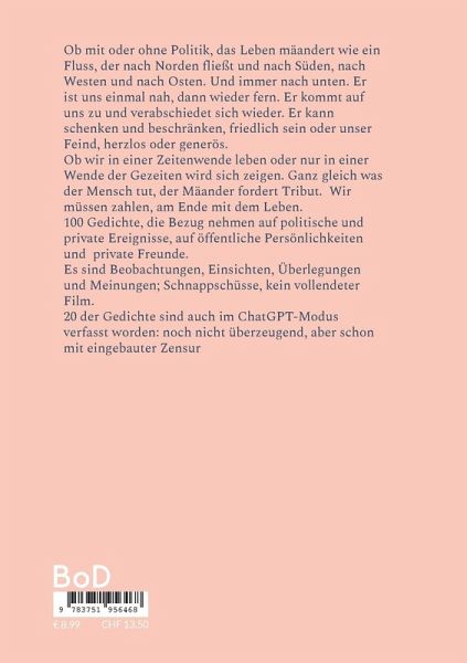 Ob mit oder ohne Politik, das Leben mäandert wir ein Fluss, der nach Norden fließt und nach Süden, nach Westen und nach Osten. Und immer nach unten. Er ist uns einmal nach, dann wieder fern. Er kommt auf uns zu und verabschiedet sich wieder. Er kann schenken und beschränken, friedlich sein oder unser Feind, herzlos oder generös.Ob wir in einer Zeitenwende leben oder nur in einer Wende der Gezeiten wird sich zeigen. Ganz gleich, was der Mensch tut, der Mäander fordert Tribut, wir müssen zahlen. Am Ende mit dem Leben.100 Gedichte, die Bezug nehmen auf politische und private Ereignisse, auf öffentliche Persönli9chkeiten und private Freunde.Es sind Beobachtungen, Einsichten, Überlegungen und Meinungen; Schnappschüsse, kein vollendeter Film.20 der Gedichte sind auch im ChatGPT-Modus verfasst worden.