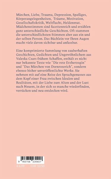 Märchen, Liebe, Trauma, Depression, Spaßiges, Körperangelegenheiten, Träume, Motivation, Gesellschaftskritik, Weltflucht, Heldenmut. Mädchenstimmen sind facettenreich und erzählen ganz unterschiedliche Geschichten. Oft stammen die unterschiedlichsten Stimmen aber aus ein und der selben Person.Das Büchlein vor Ihren Augen macht diese individuelle Vielfalt sichtbar und anfassbar.Eine komprimierte Sammlung von zauberhaften Geschichten, Gedichten und Ungewöhnlichem aus Valeska Csars frühem Schaffen, enthält es nicht nur bekannte Texte wie "Die rote Erzherzogin" und "Das Märchen von Dornroserich", sondern ebenso bisher unveröffentlichte Werke. Sie nehmen mit auf eine Reise des Sprachgenusses aus dem Kopf einer Frau zwischen Idealen und Realitäten, mit der Liebe zum Alten und der Lust nach Neuem, in der sich so manche wiederfinden, verrücken und neu entdecken wird.