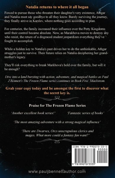 Natalia returns to where it all began Forced to pursue those who threaten their daughter's very existence, Athgar and Natalia must say goodbye to all they know. Barely surviving the journey, they finally arrive in Karslev, where nothing goes according to plan. For centuries, the family increased their influence over the Petty Kingdoms until their control became absolute. Now, as Marakhova moves to destroy any who resist, the return of a disgraced student jeopardizes everything they've fought to accomplish. While a hidden key to Natalia's past drives her to do the unthinkable, Athgar struggles just to survive. Their future relies on Natalia deciphering her grandmother's legacy. They'll risk everything to break Markhova's hold over the family, but will it be enough? Dive into a land bursting with action, adventure, and magical battles as Paul J Bennett's The Frozen Flame series continues in Book Five: Maelstrom. Grab your copy today and be amongst the first to discover what the secret key is. New to the series? Get to know Athgar and Natalia in their origin stories, Into the Fire & The Awakening, then pick up Book One: Ashes to learn how they met! What readers are saying about Paul J Bennett's books: ¿¿¿¿¿ -"Fantastic Fantasy!" ¿¿¿¿¿ -"Epic Battle Scenes! ¿¿¿¿¿ -"I'm hooked on this series!" ¿¿¿¿¿ -"Exciting Sword and Sorcery" ¿¿¿¿¿ -"Fabulously written, loved it." ¿¿¿¿¿ -"Outstanding work of fantasy" ¿¿¿¿¿ -"The most amazing adventure" ¿¿¿¿¿ -"Another excellent book series!!" Books by Paul J Bennett Heir to the Crown Series: Battle at the River - Prequel Servant of the Crown Sword of the Crown Mercerian Tales: Stories of the Past Heart of the Crown Shadow of the Crown Mercerian Tales: The Call of Magic Fate of the Crown Burden of the Crown Mercerian Tales: The Making of a Man Defender of the Crown Fury of the Crown Mercerian Tales: Honour Thy Ancestors War of the Crown Triumph of the Crown Guardian of the Crown The Frozen Flame Series: The Awakening/Into the Fire - Prequels Ashes Embers Flames Inferno Maelstrom Vortex Power Ascending Series: Tempered Steel - Prequel Temple Knight Warrior Knight Temple Captain Warrior Lord Temple Commander The Chronicles of Cyric: Into the Maelstrom - Prequel A Midwinter Murder The Beast of Brunhausen A Plague in Zeiderbruch