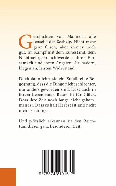 Geschichten von Männern, alle jenseits der Sechzig. Nicht mehr ganz frisch, aber immer noch gut. Im Kampf mit dem Ruhestand, dem Nichtmehrgebrauchtwerden, ihrer Einsamkeit und ihren Ängsten. Sie hadern, klagen an, leisten Widerstand. Doch dann lehrt sie ein Zufall, eine Begegnung, dass die Dinge nicht schlechter, nur anders geworden sind. Dass auch in ihrem Leben noch Raum ist für Glück. Dass ihre Zeit noch lange nicht gekommen ist. Dass es halt Herbst ist und nicht mehr Frühling. Und plötzlich erkennen sie den Reichtum dieser ganz besonderen Zeit.