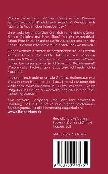 Erkenne die wahren Absichten eines Mannes. Wertvolle Antworten, hilfreiche Einschätzungen von Situationen mit Männern in Affären und im Dating. Der Ratgeber für Frauen auf dem Weg in eine feste Beziehung. (Band 2) Kapitelauszug aus dem Buch:Die geistigen Gesetze zwischen Mann und FrauFeststecken in unglücklichen EhenProfile der «Betrüger» Wann Männer ihre Ehen beenden Die vier Phasen der Abnabelung Warum Zweitfrauen scheitern Gründe, die gegen die Geliebte und Zweitfrau sprechen Männer in der Rolle als Zweitmann Kämpfen um einen vergebenen Mann Die Anziehungskraft verheirateter Männer Die Irrtümer in Liebe und Affären Was ein Mann an Intensität beim Kennenlernen wirklich fühlt Exklusivität in der Kennenlernphase Warum intensiver Sex beim Kennenlernen selten in eine Bindung führt Lassen sich Männer wirklich erobern? uvm. Dieser Ratgeber klärt auf:Warum ziehen sich Männer häufig in der Kennenlernphase aus dem Kontakt zur Frau zurück? Verlieben sich Männer in Frauen über intensiven Sex?Unter welchen Umständen lösen sich verheiratete Männer für die Geliebte aus ihren Ehen? Welche unterschiedlichen Phasen durchlaufen sie im Ablöseprozess von der Ehefrau? Woran scheitern die Geliebten und Zweitfrauen? Gehen Männer in Affären mit vergebenen Frauen?Woran können Frauen das echte Interesse von Männern erkennen? Worin unterscheiden sich Frauen und Männer in der Kennenlernphase, in Affären und Beziehungen? Warum wollen Beziehungen heutzutage nicht mehr richtig klappen?In diesem Ratgeber geht es um die Gefühle, Hoffnungen und Wünsche von Frauen in der Liebe. Und wie Männer sich weibliches Wunschdenken zu Nutze machen. Er soll Frauen als wertvoller Begleiter in eine feste Beziehung dienen.