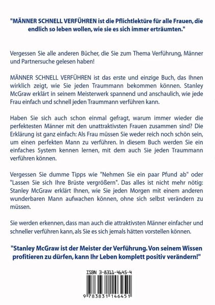 Mit seinem Buch "Männer schnell verführen" lässt Stanley McGraw einen Traum wahr werden. Den Leserinnen wird spannend und interessant vermittelt, wie man bei der Verführung von attraktiven Männern schnelle Erfolge erzielt und so sein Leben mit neuer Qualität bereichert. McGraws Buch ist ein unentbehrlicher Ratgeber für alle Frauen, die endlich ihre Chancen wahrnehmen und ihre Traummänner verführen wollen.