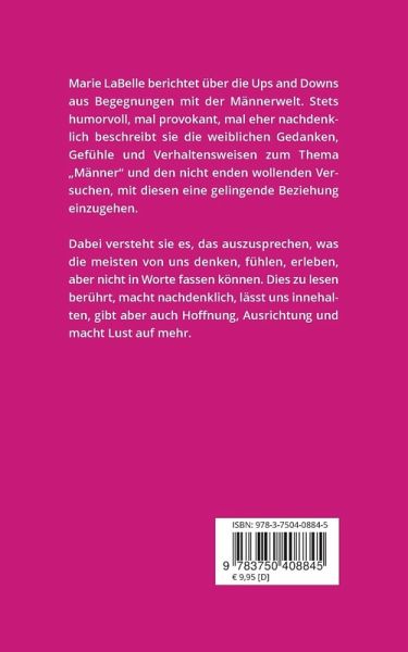 Marie LaBelle berichtet über die Ups and Downs aus Begegnungen mit der Männerwelt. Stets humorvoll, mal provokant, mal eher nachdenklich beschreibt sie die weiblichen Gedanken, Gefühle und Verhaltensweisen zum Thema 'Männer' und den nicht enden wollenden Versuchen, mit diesen eine gelingende Beziehung einzugehen.Dabei versteht sie es, das auszusprechen, was die meisten von uns denken, fühlen, erleben, aber nicht in Worte fassen können. Dies zu lesen berührt, macht nachdenklich, lässt uns innehalten, gibt aber auch Hoffnung, Ausrichtung und macht Lust auf mehr.