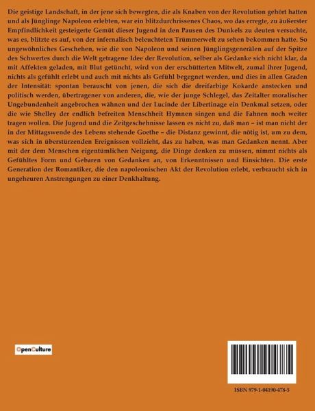 Die geistige Landschaft, in der jene sich bewegten, die als Knaben von der Revolution gehört hatten und als Jünglinge Napoleon erlebten, war ein blitzdurchrissenes Chaos, wo das erregte, zu äußerster Empfindlichkeit gesteigerte Gemüt dieser Jugend in den Pausen des Dunkels zu deuten versuchte, was es, blitzte es auf, von der infernalisch beleuchteten Trümmerwelt zu sehen bekommen hatte. So ungewöhnliches Geschehen, wie die von Napoleon und seinen Jünglingsgenerälen auf der Spitze des Schwertes durch die Welt getragene Idee der Revolution, selber als Gedanke sich nicht klar, da mit Affekten geladen, mit Blut getüncht, wird von der erschütterten Mitwelt, zumal ihrer Jugend, nichts als gefühlt erlebt und auch mit nichts als Gefühl begegnet werden, und dies in allen Graden der Intensität: spontan berauscht von jenen, die sich die dreifarbige Kokarde anstecken und politisch werden, übertragener von anderen, die, wie der junge Schlegel, das Zeitalter moralischer Ungebundenheit angebrochen wähnen und der Lucinde der Libertinage ein Denkmal setzen, oder die wie Shelley der endlich befreiten Menschheit Hymnen singen und die Fahnen noch weiter tragen wollen. Die Jugend und die Zeitgeschehnisse lassen es nicht zu, daß man ¿ ist man nicht der in der Mittagswende des Lebens stehende Goethe ¿ die Distanz gewinnt, die nötig ist, um zu dem, was sich in überstürzenden Ereignissen vollzieht, das zu haben, was man Gedanken nennt. Aber mit der dem Menschen eigentümlichen Neigung, die Dinge denken zu müssen, nimmt nichts als Gefühltes Form und Gebaren von Gedanken an, von Erkenntnissen und Einsichten. Die erste Generation der Romantiker, die den napoleonischen Akt der Revolution erlebt, verbraucht sich in ungeheuren Anstrengungen zu einer Denkhaltung.