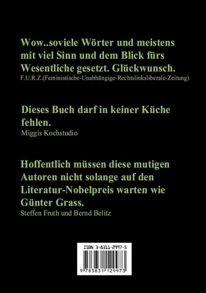 Was Sie schon immer über die Beziehung Mann und Frau wissen wollten, aber nie zu fragen wagten. Gespickt mit tollen Ilustrationen ein Lesespaß für die ganze Familie. Hier wird mit dem sexistischen und emanzipierten Geschlechterwahnsinn aufgeräumt. Jeder bekommt sein Fett weg. Angefangen bei Adam und Eva, warum sie wirklich aus dem Paradies flogen. In einzigartigen aber nie anstößigen Gedichten werden die Vorurteile in der Geschlechterbeziehung dargestellt. Liebevolle Fabeln zeigen, daß auch Tiere nur Menschen sind oder umgekehrt. Schonungslos wird der Leistungsdruck des Mannes in einer Beziehung offengelegt. Tabus werden gebrochen und die wahren Hintergründe beleuchtet. Wie Märchen wirklich entstanden sind erfahren Sie hier ebenso wie Tips und Tricks für ein erfülltes Sexualleben. Ein ideales Geschenk für Jung und Alt, für Mann und Frau. Auf alle Fälle ein Büchlein für herzhaftes Lachen und mit einem guten Schuß Selbstironie. Viel Spaß beim Lesen.