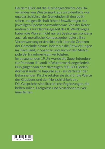 Bei dem Blick auf die Kirchengeschichte des Havellandes von Wustermark aus wird deutlich, wie eng das Schicksal der Gemeinde mit den politischen und gesellschaftlichen Umwälzungen der jeweiligen Epochen verwoben war. Von der Reformation bis zur Nachkriegszeit des II. Weltkrieges haben die Pfarrer nicht nur als Seelsorger, sondern auch als moralische Kompassgeber agiert. Ihre Verantwortung erstreckte sich über die Grenzen der Gemeinde hinaus, indem sie die Entwicklungen im Havelland, in Spandau und auch in der Metropole Berlin aufmerksam verfolgten. Im ausgehenden 19. Jh. wurde die Superintendentur Potsdam II (Land) in Wustermark angesiedelt. Nun gingen von dem damaligen 500-800 Seelendorf erstaunliche Impulse aus - als Vertreter der Bekennenden Kirche setzten sie sich für die Werte des Glaubens und der Menschlichkeit ein. Die Gespräche sind literarische Ergänzungen, die helfen sollen, Ereignisse und Situationen zu verinnerlichen.