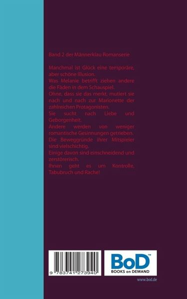 Band 2 der Männerklau RomanserieManchmal ist Glück eine temporäre, aber schöne Illusion.Was Melanie betrifft, ziehen andere die Fäden in dem Schauspiel.Ohne, dass sie das merkt, mutiert sie nach und nach zur Marionette der zahlreichen Protagonisten.Sie sucht nach Liebe und Geborgenheit.Andere werden von weniger romantischen Gesinnungen getrieben. Die Beweggründe ihrer Mitspieler sind vielschichtig. Einige davon sind einschneidend und zerstörerisch. Ihnen geht es um Kontrolle, Tabubruch und Rache!