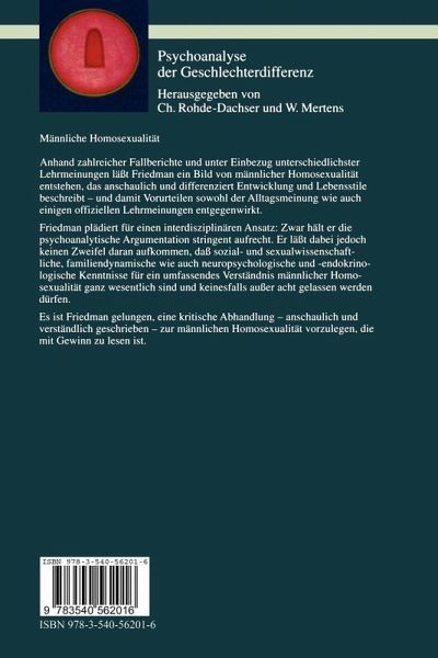 Anhand zahlreicher Fallberichte und unter Einbezug unterschiedlichster Lehrmeinungen läßt Friedman ein Bild von männlicher Homosexualität entstehen, das anschaulich und differenziert Entwicklung und Lebensstile beschreibt - und damit Vorurteilen sowohl der Alltagsmeinung wie auch einigen offiziellen Lehrmeinungen entgegenwirkt. Friedman plädiert für einen interdisziplinären Ansatz: Zwar hält er die psychoanalytische Argumentation stringent aufrecht. Er läßt dabei jedoch keinen Zweifel daran aufkommen, daß sozial- und sexualwissenschaftliche, familiendynamische wie auch neuropsychologische und endokrinologische Kenntnisse für ein umfassendes Verständnis männlicher Homosexualität ganz wesentlich sind und keinesfalls außer acht gelassen werden dürfen. Es ist Friedman gelungen, eine kritische Abhandlung - anschaulich und verständlich geschrieben - zur männlichen Homosexualtät vorzulegen, die mit Gewinn zu lesen ist.