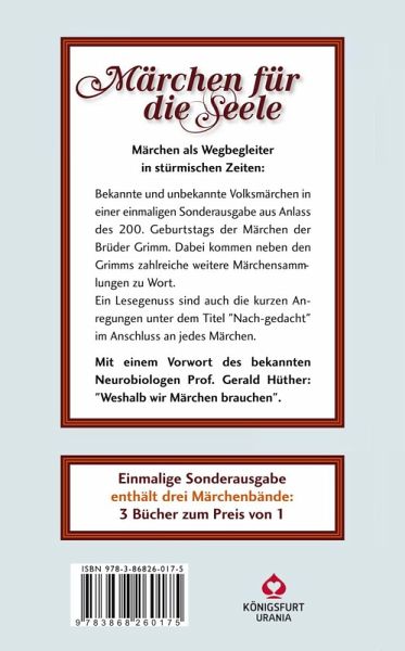 Eine Sammlung internationaler Volksmärchen, ausgewählt aus Einzelbänden der Europäischen Märchengesellschaft ("Traumhaus und Wolkenschloss", "Märchen, an denen mein Herz hängt", "Diebe, Dummlinge, Faulpelze & Co."). Mit einem ausführlichen Vorwort des bekannten Neurobiologen Prof. Dr. Gerald Hüther zur Wichtigkeit von Märchen für die Entwicklung bei Kindern: Märchen erzählt oder vorgelesen zu bekommen fördert die Aufmerksamkeit, Fantasie und den Sprachschatz. Märchen stärken Mut und Vertrauen und befähigen zu Verständnis und Mitgefühl. Die Märchen dieser Sammlung sind international, es sind Volksmärchen ganz unterschiedlicher Kulturen, sie führen den Leser von Deutschland über (fast) alle Länder Europas bis nach Indien, China, Südamerika, Sibirien usw.