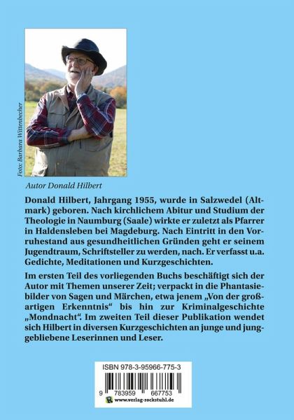Autor: Donald Hilbert. Taschenbuch, 124 SeitenVORWORTWas hier geschrieben steht, ist Phantasieprodukt. Dennoch aber bedeutet es ein Spiegelbild dessen, was ich tatsächlich erlebe und fühle in unserer Gesellschaft und was mich deshalb bewegt. In Bilder und Gleichnisse verpackt breite ich es nun vor Dir, liebe Leserin, lieber Leser, aus. In den bunten Phantasiebildern sind Fragen verborgen, die ich an die Welt und auch an Dich habe: "Verhält es sich tatsächlich so?", "Was hättest du getan?", "War mein Blick etwa getrübt und habe ich deshalb etwas falsch gesehen?" Betrachte, was ich dir hiermit vorlege, mit deinem geistigen Auge sorgfältig, und wenn es zu dir passt, dann nimm es getrost in dein Herz!INHALTSVERZEICHNISMÄRCHEN- UND SAGENHAFTES DIE GANS GERDA DIE GOLDENE NADEL FRAUENGRAB DIE ZWEI RIESEN DAS MÄRCHEN VOM WISSBEGIERIGEN STEIN KABIL DAS MÄDCHEN UND DIE ZAUBERIN MICHEL UND DIE LEUCHTENDE DAS HÄSSLICHE DER STEINERNE NIKOLAUS DAS MÄRCHEN VON DER GROSSARTIGEN ERKENNTNIS DER WURM MONDNACHT FÜR JÜNGRE UND JUNGGEBLIEBENE KARLCHEN UND DIE FLUT DIE KRONE PUSTEBLUMEN DER SCHULWEG JAGD NACH DEM REGENBOGEN ANTON, IDA UND DAS SCHAF DREI WELTEN DAS ARMBAND BEKRITZELTE WAND DER ERSTE SCHRITT SCHERBEN DER VERGEBUNG IRGENDWANN IST JETZT KATHRINS OSTERN DER STOTTERER IN SCHWERER ZEIT STORY-HEINER GESEHEN UND VERSTECKT SEIN