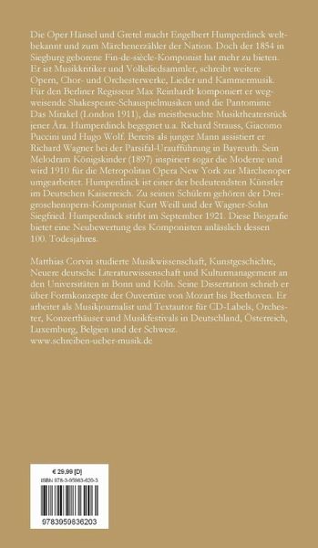 Die Oper Hänsel und Gretel macht Engelbert Humperdinck weltbekannt und zum Märchenerzähler der Nation. Doch der 1854 in Siegburg geborene Fin-de-siècle-Komponist hat mehr zu bieten. Er ist Musikkritiker und Volksliedsammler, schreibt weitere Opern, Chor- und Orchesterwerke, Lieder und Kammermusik. Für den Berliner Regisseur Max Reinhardt komponiert er wegweisende Shakespeare-Schauspielmusiken und die Pantomime Das Mirakel (London 1911), das meistbesuchte Musiktheaterstück jener Ära. Humperdinck begegnet u.a. Richard Strauss, Giacomo Puccini und Hugo Wolf. Bereits als junger Mann assistiert er Richard Wagner bei der Parsifal-Uraufführung in Bayreuth. Sein Melodram Königskinder (1897) inspiriert sogar die Moderne und wird 1910 für die Metropolitan Opera New York zur Märchenoper umgearbeitet. Humperdinck ist einer der bedeutendsten Künstler im Deutschen Kaiserreich. Zu seinen Schülern gehören der Dreigroschenopern-Komponist Kurt Weill und der Wagner-Sohn Siegfried. Humperdinck stirbt im September 1921. Diese Biografie bietet eine Neubewertung des Komponisten anlässlich dessen 100. Todesjahres.