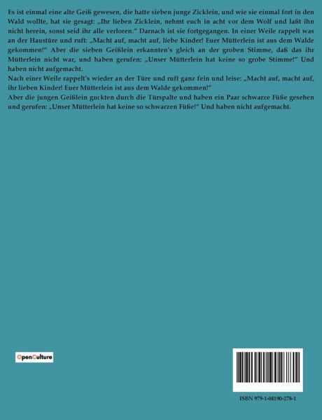 Es ist einmal eine alte Geiß gewesen, die hatte sieben junge Zicklein, und wie sie einmal fort in den Wald wollte, hat sie gesagt: ¿Ihr lieben Zicklein, nehmt euch in acht vor dem Wolf und laßt ihn nicht herein, sonst seid ihr alle verloren.¿ Darnach ist sie fortgegangen. In einer Weile rappelt was an der Haustüre und ruft: ¿Macht auf, macht auf, liebe Kinder! Euer Mütterlein ist aus dem Walde gekommen!¿ Aber die sieben Geißlein erkannten¿s gleich an der groben Stimme, daß das ihr Mütterlein nicht war, und haben gerufen: ¿Unser Mütterlein hat keine so grobe Stimme!¿ Und haben nicht aufgemacht. Nach einer Weile rappelt¿s wieder an der Türe und ruft ganz fein und leise: ¿Macht auf, macht auf, ihr lieben Kinder! Euer Mütterlein ist aus dem Walde gekommen!¿ Aber die jungen Geißlein guckten durch die Türspalte und haben ein Paar schwarze Füße gesehen und gerufen: ¿Unser Mütterlein hat keine so schwarzen Füße!¿ Und haben nicht aufgemacht.