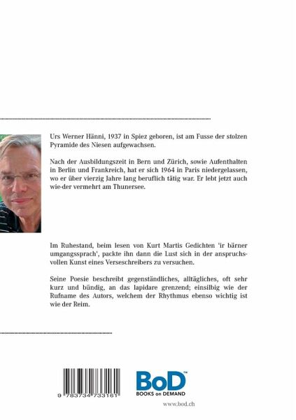 Im Ruhestand, beim lesen von Kurt Martis Gedichten 'ir bärner umgangssprach', packte Urs W. Hänni die Lust sich in der anspruchsvollen Kunst eines Verseschreibers zu versuchen.Seine Poesie beschreibt gegenständliches, alltägliches, oft kurz und bündig, an das lapidare grenzend; einsilbig wie der Rufname des Autors, welchem der Rhythmus ebenso wichtig ist wie der Reim.