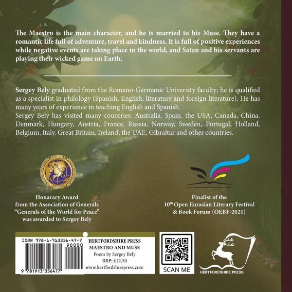 The Maestro is the main character, and he is married to his Muse. They have a romantic life full of adventure, travel and kindness. It is full of positive experiences while negative events are taking place in the world, and Satan and his servants are playing their wicked game on Earth. Sergey Bely graduated from the Romano-Germanic University faculty; he is qualified as a specialist in philology (Spanish, English, literature and foreign literature). He has many years of experience in teaching English and Spanish. Sergey Bely has visited many countries: Australia, Spain, the USA, Canada, China, Denmark, Hungary, Austria, France, Russia, Norway, Sweden, Portugal, Holland, Belgium, Italy, Great Britain, Ireland, the UAE, Gibraltar and other countries. Award from the Association of Generals "Generals of the World for Peace" was awarded to Sergey Bely Finalist of the 10th Open Eurasian Literary Festival & Book Forum (OEBF-2021)
