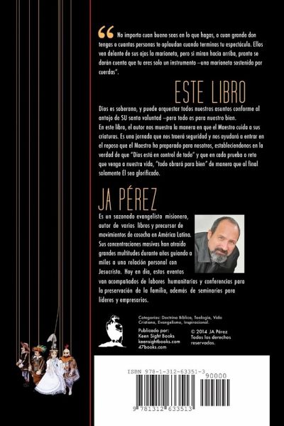 JA Pérez nos sorprende con esta sencilla nueva obra sobre el tema de la soberanía de Dios. No importa cuan bueno seas en lo que hagas, o cuan grande don tengas o cuantas personas te aplaudan cuando terminas tu espectáculo. Ellos ven delante de sus ojos la marioneta, pero si miran hacia arriba, pronto se darán cuenta que tu eres solo un instrumento -una marioneta sostenida por cuerdas" Dios es soberano, y puede orquestar todos nuestros asuntos conforme al antojo de su santa voluntad -pero todo es para nuestro bien. En este libro, el autor nos muestra la manera en que el Maestro cuida a sus criaturas. Es una jornada que nos traerá seguridad y nos ayudará a entrar en el reposo que el Maestro ha preparado para nosotros, estableciéndonos en la verdad de que "Dios está en control de todo" y que en cada prueba o reto que venga a nuestra vida, "todo obrará para bien" de manera que al final solamente él sea glorificado.