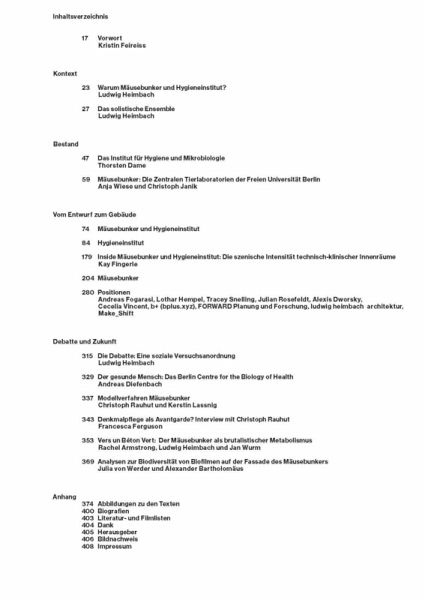 Dokumentiert die Entstehungs- und Nutzungsgeschichte zweier West-Berliner Großbauten Mit Fotografien von Kay Fingerle und künstlerischen Beiträgen von b+, Alexis Dworsky, Andreas Fogarasi, FORWARD Planung und Forschung, Lothar Hempel, ludwig heimbach architektur, make_shift, Julian Rosefeldt, Tracey Snelling und Cecilia Vincent Basiert auf der erfolgreichen Ausstellung Mäusebunker & Hygieneinstitut: Versuchsanordnung BERLIN (BDA Galerie Berlin, 2020)