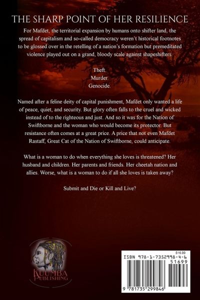 "Been along time since a book made me feel so much!! I was on a roller coaster of happiness, excitement, heart break and joy!" Amazon Review THE SHARP POINT OF HER RESILIENCE For Mafdet, the territorial expansion by humans onto shifter land, the spread of capitalism and so-called democracy weren't historical footnotes to be glossed over in the retelling of a nation's formation but premeditated violence played out on a grand, bloody scale against shapeshifters. Theft. Murder. Genocide. Named after a feline deity of capital punishment, Mafdet only wanted a life of peace, quiet, and security. But glory often falls to the cruel and wicked instead of to the righteous and just. And so it was for the Nation of Swiftborne and the woman who would become its protector. But resistance often comes at a great price. A price that not even Mafdet Rastaff, Great Cat of the Nation of Swiftborne, could anticipate. What is a woman to do when everything she loves is threatened? Her husband and children. Her parents and friends. Her cheetah nation and allies.Worse, what is a woman to do if all she loves is taken away? Submit and Die? Or Kill and Live?