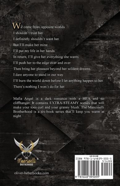 We come from opposite worlds. I shouldn't trust her. I definitely shouldn't want her. But I'll make her mine. I'll put my life in her hands. In return, I'll give her everything she wants. I push her to the edge over and over. Then bring her pleasure beyond her wildest dreams. I dare anyone to stand in our way. I'll burn the world down before I let anything happen to her. There's nothing I won't do for her. Mafia Angel is a dark romance with a HEA and no cliffhanger. It contains EXTRA-STEAMY scenes that will make your toes curl and your granny blush. The Mancinelli Brotherhood is a six-book series that'll keep you warm at night.