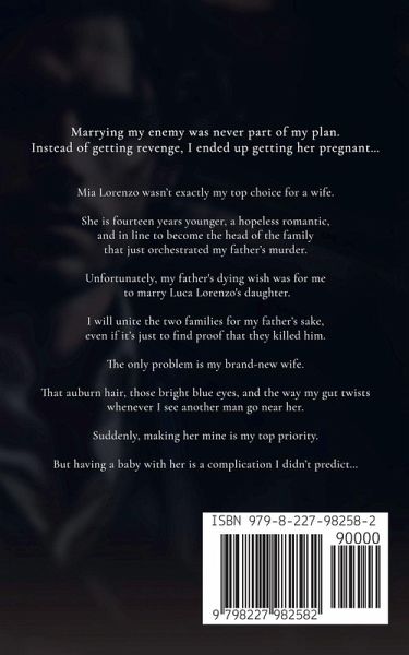 Marrying my enemy was never part of my plan. Instead of getting revenge, I ended up getting her pregnant... Mia Lorenzo wasn't exactly my top choice for a wife. She is fourteen years younger, a hopeless romantic, and in line to become the head of the family that just orchestrated my father's murder. Too bad my father's dying wish was for me to marry Luca Lorenzo's daughter. I will unite the two families for my father's sake, even if it's just to find proof that they killed him. The only problem is my brand-new wife. That auburn hair, those bright blue eyes, and the way my gut twists whenever I see another man go near her. Suddenly, making her mine is my top priority. But having a baby with her is a complication I didn't predict...