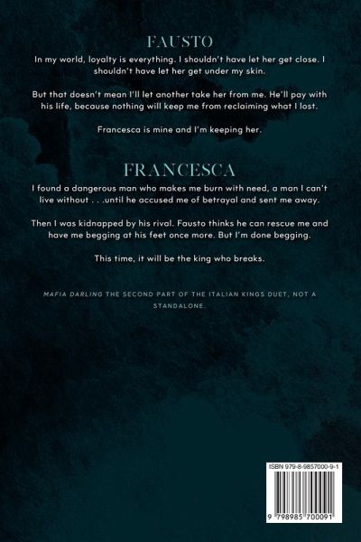 FAUSTO In my world, loyalty is everything. I shouldn't have let her get close. I shouldn't have let her get under my skin. But that doesn't mean I'll let another take her from me. He'll pay with his life, because nothing will keep me from reclaiming what I lost. Francesca is mine and I'm keeping her. FRANCESCA I found a dangerous man who makes me burn with need, a man I can't live without . . .until he accused me of betrayal and sent me away. Then I was kidnapped by his rival. Fausto thinks he can rescue me and have me begging at his feet once more. But I'm done begging. This time, it will be the king who breaks. Book 2 in the Kings of Italy series, MAFIA DARLING is the exciting conclusion to Fausto and Frankie's story.