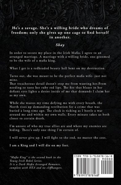 He's a savage. She's a willing bride who dreams of freedom; only she gives up one cage to find herself in another. Emma I was a willing sacrifice in an arranged marriage. Until my father made a new deal and gave me to another. Now I must marry a savage. A Northerner- the very thing I had been taught to hate. I vow to never be his. I will never belong to Shay O'Reagan. I will defy him every step of the way. He may lay claim to my body, but he will never own my heart. Shay In order to secure my place in the Irish Mafia, I agree to an arranged marriage. A marriage with a willing bride, one groomed to be the wife of a mafia king. What I get is a redheaded beauty hell bent on my destruction. Turns out, she was meant to be the perfect mafia wife- just not mine. That treacherous detail doesn't stop me from wanting her. From needing to taste her ruby red lips. The fire that blazes in her defiant eyes lights a desire inside of me that demands I claim her as my own. While she wastes my time defying me with every breath, the North rises up demanding retribution for a crime that was buried a long time ago. The clock is ticking as I battle a war around me and within my own walls. Every minute takes us both closer to certain death. I'm unsure of who my true allies are and where my enemies are hiding. There's only one thing I'm certain of. I will never give up. I will fight to the end, no matter the cost. I am a King and I will die on my feet. "Mafia King" is the second book in the Young Irish Rebel Series. It is a Dark Mafia Arranged Romance, complete with HEA and no cliffhangers.