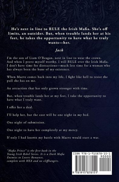 He's next in line to RULE the Irish Mafia. She's off limits, an outsider. But, when trouble lands her at his feet, he takes the opportunity to have what he truly wants-her. Jack She's the bane of my existence. But, when trouble lands her at my feet, I take the opportunity to have what I truly want. I offer her a deal. I'll help her, but the cost will be one night in my bed. One night of submission. One night to have her completely at my mercy. I hope with my want for her out of my system, I can focus on the crown that belongs on my head. I'm the son of Liam O'Reagan, and I am next in line to wear the crown. And when I prove myself worthy, I will RULE over the Irish Mafia. If only I had known my battle with Maeve would start a war that may cost me my throne. Maeve Jack is the only one who can help me. Too bad, he hates me. But I have no choice but to go to him. It turns out, hate is a powerful motivator, and I just handed him a way to punish me. He offers me his help-for a price. Everything in his world has a price. One night in his bed. He's everything a woman would want, so this should be easy. Only, I'm a virgin, and he terrifies me. I should run, but I won't. I can't. I just pray this one night doesn't destroy us both. "Mafia Prince" is the first book in the Young Irish Rebel Series. It is a Dark Mafia Enemies to Lovers Romance, complete with HEA and no cliffhangers.