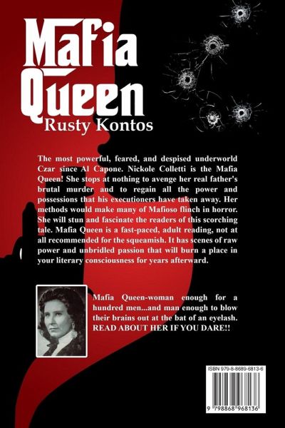 "MAFIA QUEEN! The most powerful, feared, and despised underworld Czar since Al Capone. Nickole Colletti is the Mafia Queen! She stops at nothing to avenge her real father's brutal murder and to regain all the power and possessions that his executioners have taken away. Her methods would make many of Mafioso flinch in horror. She will stun and fascinate the readers of this scorching tale. Mafia Queen is a fast-paced, adult reading, not at all recommended for the squeamish. It has scenes of raw power and unbridled passion that will burn a place in your literary consciousness for years afterward. Mafia Queen-woman enough for a hundred men...and man enough to blow their brains out at the bat of an eyelash. READ ABOUT HER IF YOU DARE!!"