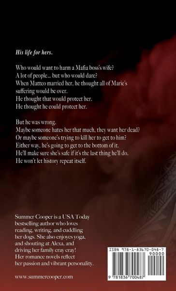 Indulge in this dark mafia romance series by USA Today Bestselling contemporary billionaire romance author Summer Cooper. His life for hers. Who would want to harm a Mafia boss's wife? A lot of people... but who would dare? When Matteo married her, he thought all of Marie's suffering would be over. He thought that would protect her. He thought he could protect her. But he was wrong. Maybe someone hates her that much, they want her dead? Or maybe someone's trying to kill her to get to him? Either way, he's going to get to the bottom of it. He'll make sure she's safe if it's the last thing he'll do. He won't let history repeat itself. This is an adult only steamy contemporary romance, appealing to readers who love fated mates, insta love, bad boy and sizzling hot romances with a twist. Perfect for fans of Luna Mason, Eva Winners, Michelle Heard, K.Bromberg and Lucy Darling.