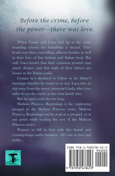 Before the crime, before the power-there was love. When Giada and Luca end up at the same boarding school, the friendship is instant. They bond over their controlling, affluent families and their love of fine fashion and Italian food. But only Luca knows that their common ground runs much deeper...and that both of their fathers are bosses in the Italian mafia. Certain he's destined to follow in his father's footsteps whether he wants to or not, Luca tries to stay away from the sweet, innocent Giada, who's too naïve to see the cracks in her own family tree. But he can't resist her for long. Mafiosa Princess Beginnings is the captivating prequel to the Mafiosa Princess series. Mafiosa Princess Beginnings can be read as a prequel, or at any point while reading the rest of the Mafiosa Princess series. Prepare to fall in love with this brand new coming-of-age mafia romance. All's fair in love and mafia...