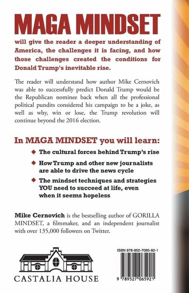 MAGA MINDSET: How to Make YOU and America Great Again is not a traditional political analysis of Donald Trump or the success of his political campaign, which would be boring and useless to you. MAGA Mindset is an overview of the cultural forces that have propelled Trump forward while using the example of his candidacy as a case study for your own life. MAGA MINDSET will give you a deeper understanding of America, the challenges it is facing, and how those challenges created the conditions for Donald Trump’s inevitable rise. You will understand how Mike Cernovich was able to successfully predict Donald Trump would be the Republican nominee at a time when all the professional political pundits considered his campaign to be a joke, and why, win or lose, the Trump revolution will continue beyond the 2016 election. In MAGA Mindset you will learn: The cultural forces behind Trump's rise How Trump and other masters of social media are able to drive the news cycle The mindset techniques and strategies YOU need to succeed at life, even when it seems hopeless Mike Cernovich is the bestselling author of GORILLA MINDSET. He is a lawyer, a journalist who has broken several news stories of international interest, and the producer of the film documentary SILENCED.