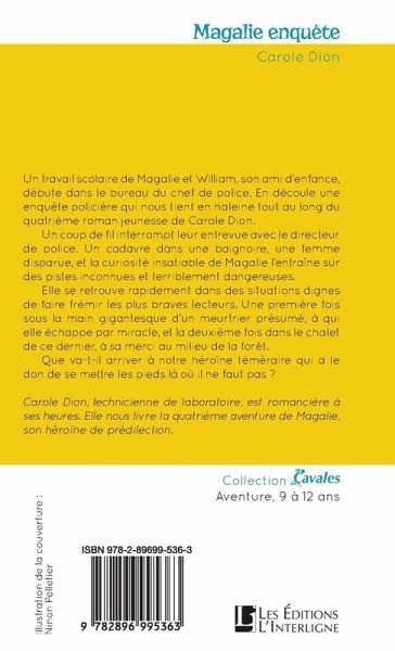 Un travail scolaire de Magalie et William, son ami d'enfance, débute dans le bureau du chef de police. En découle une enquête policière qui nous tient en haleine tout au long du quatrième roman jeunesse de Carole Dion. Un coup de fil interrompt leur entrevue avec le directeur de police. Un cadavre dans une baignoire, une femme disparue, et la curiosité insatiable de Magalie l'entraîne sur des pistes inconnues et terriblement dangereuses. Elle se retrouve rapidement dans des situations dignes de faire frémir les plus braves lecteurs. Une première fois sous la main gigantesque d'un meurtrier présumé, à qui elle échappe par miracle, et la deuxième fois dans le chalet de ce dernier, à sa merci au milieu de la forêt. Que va-t-il arriver à notre héroïne téméraire qui a le don de se mettre les pieds là où il ne faut pas ?
