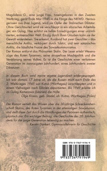Eine Erzählung, die das Leben einer Kriegsgeneration zeichnet, hineingerissen in eine teuflische Ideologie des Sowjetkommunismus. Ein Roman, der den Fokus richtet auf Millionenfaches Morden, von Christen, Juden und Deutschen in der Zeit der Stalin-Diktatur. Polen 18. Januar 1945: Die Front hat den Warthegau erreicht. Tausende Deutsche sind auf der Flucht. Von der Roten Armee überrollt, wird ein großer Teil von Ihnen in die Polnischen Dörfer zurück geschickt. Magdalena, eine 18jährige junge Frau, wird herausgerissen aus ihrem bisherigen Leben, als sie nach Kriegsende in die Fänge des NKWD gerät. Mit Hunderten Gefangenen wird sie nach Sibirien deportiert. Ihre Träume und Hoffnungen werden jäh zerstört, sie findet sich mitten im Sterben: Endstation Gulag. Sie erlebt eine unvorstellbare Wirklichkeit zwischen menschlicher Kälte und unwirtlicher Natur. Spürt am eignen Leib ein satanisches System. Menschen werden zu Sklaven erniedrigt, Objekt sexueller Gier, Rechtlosigkeit. Im Straflager erfährt sie die Brutalität tiefster Erniedrigung. Von Hunger und Kälte gezeichnet, ist sie ständiger Gefahr ausgesetzt. Durch Maria, eine Russlanddeutsche, bekommt sie Einblick in das Wesen Stalins. Ein Tyrann, der skrupellos sein Land ruiniert. Millionen werden In einer Hungerskatastrophe 1932 hingerafft, verursacht durch Zwangsenteignung. Das Regime der Gewalt gipfelt in der Zeit des Roten Terrors 1937/38. Bad Liebenzell, Juni 2015
