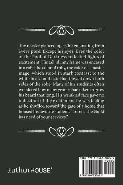 The master glanced up, calm emanating from every pore. Except his eyes. Eyes the color of the Pool of Darkness reflected lights of excitement. His tall, skinny frame was encased in a robe the color of ruby, the color of a master mage, which stood in stark contrast to the white beard and hair that flowed down both sides of the robe. Many of his students often wondered how many years it had taken to grow his beard that long. His wrinkled face gave no indication of the excitement he was feeling as he shuffled toward the gate of a home that housed his favorite student. Toren. The Guild has need of your services.