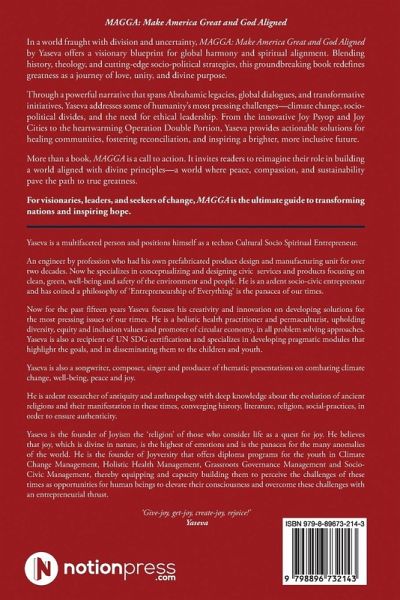 MAGGA: Make America Great and God Aligned In a world fraught with division and uncertainty, MAGGA: Make America Great and God Aligned by Yaseva offers a visionary blueprint for global harmony and spiritual alignment. Blending history, theology, and cutting-edge socio-political strategies, this groundbreaking book redefines greatness as a journey of love, unity, and divine purpose. Through a powerful narrative that spans Abrahamic legacies, global dialogues, and transformative initiatives, Yaseva addresses some of humanity's most pressing challenges-climate change, socio-political divides, and the need for ethical leadership. From the innovative Joy Psyop and Joy Cities to the heartwarming Operation Double Portion, Yaseva provides actionable solutions for healing communities, fostering reconciliation, and inspiring a brighter, more inclusive future. More than a book, MAGGA is a call to action. It invites readers to reimagine their role in building a world aligned with divine principles-a world where peace, compassion, and sustainability pave the path to true greatness. For visionaries, leaders, and seekers of change, MAGGA is the ultimate guide to transforming nations and inspiring hope.