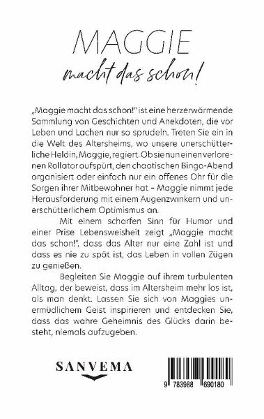 "Maggie macht das schon!" ist eine hererwärmende Sammlung von Gschichten und Anekdoten, die vor Leben und Lachen nur so sprudeln. Treten Sie ein in die Welt des Altersheims, wo unsere unerschütterliche Heldin, Maggie, regiert. Ob sie nun einen verlorenen Rollator aufspürt, den chaotischen Bingo-Abend organisiert oder einfach nur ein offenes Ohr für die Sorgen ihrer Mitbewohner hat - Maggie nimmt jede Herausforderung mit einem Augenzwinkern und unerschütterlichem Optimismus an. Mit einem scharfen Sinn für Humor und einer Prise Lebensweisheit zeigt "Maggie macht das schon!", dass das Alter nur eine Zahl ist und dass es nie zu spät ist, das Leben in vollen Zügen zu genießen. Begleiten Sie Maggie auf ihrem turbulenten Alltag, der beweist, dass im Altersheim mehr los ist, als man denkt. Lassen Sie sich von Maggies unermüdlichem Geist inspirieren und entdecken Sie, dass das wahre Geheimnis des Glücks darin besteht, niemals aufzugeben.