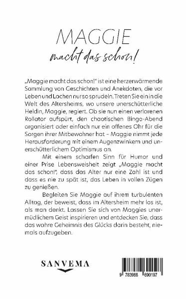"Maggie macht das schon!" ist eine hererwärmende Sammlung von Gschichten und Anekdoten, die vor Leben und Lachen nur so sprudeln. Treten Sie ein in die Welt des Altersheims, wo unsere unerschütterliche Heldin, Maggie, regiert. Ob sie nun einen verlorenen Rollator aufspürt, den chaotischen Bingo-Abend organisiert oder einfach nur ein offenes Ohr für die Sorgen ihrer Mitbewohner hat - Maggie nimmt jede Herausforderung mit einem Augenzwinkern und unerschütterlichem Optimismus an. Mit einem scharfen Sinn für Humor und einer Prise Lebensweisheit zeigt "Maggie macht das schon!", dass das Alter nur eine Zahl ist und dass es nie zu spät ist, das Leben in vollen Zügen zu genießen. Begleiten Sie Maggie auf ihrem turbulenten Alltag, der beweist, dass im Altersheim mehr los ist, als man denkt. Lassen Sie sich von Maggies unermüdlichem Geist inspirieren und entdecken Sie, dass das wahre Geheimnis des Glücks darin besteht, niemals aufzugeben.