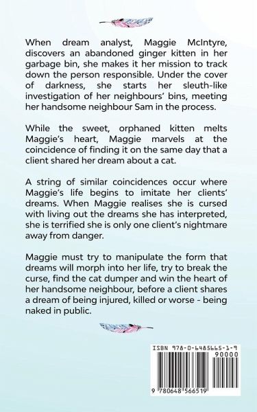 When dream consultant, Maggie McIntyre, discovers an abandoned ginger kitten in her garbage bin, she makes it her mission to track down the person responsible. Under the cover of darkness, she starts her sleuth like investigation of her neighbours' bins, meeting her handsome neighbour Sam in the process. While the sweet, orphaned kitten melts Maggie's heart, Maggie marvels at the coincidence of finding it on the same day that a client shared with her a dream about a cat. A string of similar coincidences occur where Maggie's life begins to imitate her client's dreams. When Maggie realises she is cursed with living out the dreams she has interpreted, she is terrified she is only one client's nightmare away from danger. Maggie has to try to manipulate the form that dreams will be morphed into her life, try to break the curse, find the cat dumper and win the heart of her handsome neighbour, before a client shares a dream of being injured, killed or worse - being naked in public.