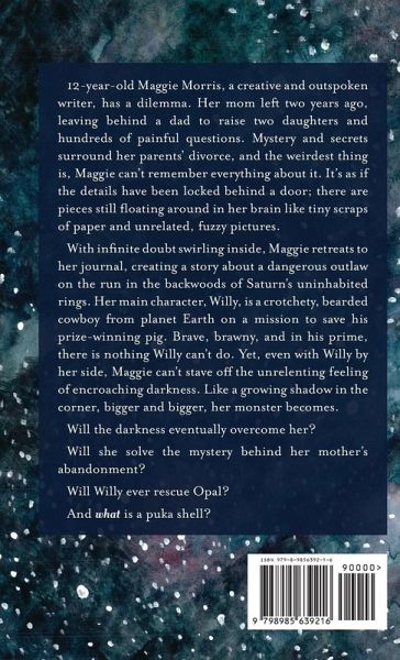 12-year-old Maggie Morris, a creative and outspoken writer, has a dilemma. Her mom left two years ago, leaving behind a dad to raise two daughters and hundreds of painful questions. Mystery and secrets surround her parents' divorce, and the weirdest thing is, Maggie can't remember everything about it. It's as if the details have been locked behind a door; there are pieces still floating around in her brain like tiny scraps of paper and unrelated, fuzzy pictures. With infinite doubt swirling inside, Maggie retreats to her journal, creating a story about a dangerous outlaw on the run in the backwoods of Saturn's uninhabited rings. Her main character, Willy, is a crotchety, bearded cowboy from planet Earth on a mission to save his prize-winning pig. Brave, brawny, and in his prime, there is nothing Willy can't do. Yet, even with Willy by her side, Maggie can't stave off the unrelenting feeling of encroaching darkness. Like a growing shadow in the corner, bigger and bigger, her monster becomes. Will the darkness eventually overcome her? Will she solve the mystery behind her mother's abandonment? Will Willy ever rescue Opal? And what is a puka shell?