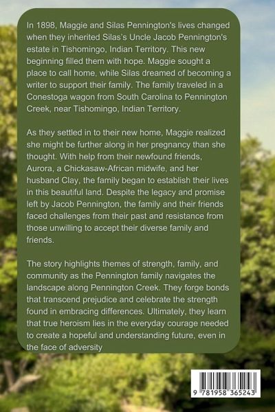 In 1898, Maggie and Silas Pennington's lives took an unexpected turn when they inherited Silas's Uncle Jacob Pennington's estate in Tishomingo, Indian Territory. This unforeseen event sparked a journey to their new home, filled with hope and the promise of a new beginning. Maggie longed for a place to call her own, while Silas harbored dreams of becoming a writer to support their growing family. Amidst the trials of settling into their new home, a few miles northwest of Tishomingo, Indian Territory, Maggie discovers she might be further along in her pregnancy than she realized. With the help of newfound friends like Aurora, a Chickasaw-African midwife, and her husband Clay, the family begins to carve their place in this beautiful place. As they explore the legacy left for them by Jacob Pennington and face challenges from their past, they find courage and resilience in the face of adversity, a testament to the strength of the human spirit. With Maggie's determination, Silas's aspirations in publishing, and the support of their community, they sought to build a life rich in love, acceptance, and unity. However, as they embraced their fresh beginnings, they faced resistance from those unwilling to accept their diverse family and friends, bringing threats that jeopardized their newfound happiness and sense of belonging. This tale highlights themes of strength, family, friendship, and the power of community. The Pennington family navigates the wild landscape along the banks of Pennington Creek in Tishomingo, forging bonds that transcend prejudice and celebrating the strength of embracing differences. As they stand together against challenges, they discover that true heroism is not about dramatic acts but about the everyday bravery needed to create a future filled with hope and understanding, even though there are those unwilling to accept their diverse family and friends. They face threats that put their newfound happiness and sense of belonging at risk. It is a tale of strength, family, friendship, and the power of community. The Pennington family navigates the wild landscape on the banks of Pennington Creek and Tishomingo, forging bonds that transcend prejudice and celebrating the strength found in embracing differences. As they stand together against adversity, they learn that true heroism lies not in grand gestures but in the everyday courage to build a future filled with hope and understanding.