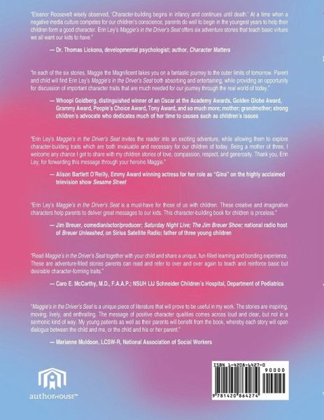 Maggie's in the Driver's Seat, by Erin Ley, is a children's book intended for ages four and up. It is comprised of six fun-filled, action-packed stories centered around the main character, Maggie the Magnificent, and her spaceship. Maggie is a twelve-year-old space academy student in the year 3510, whose loving heart, curious mind, and certainly adventurous and persistent spirit take her to six different planets within the six stories. Each story entails her traveling to a different planet and occasions the need to demonstrate a different and dominant positive character trait: 1) Responsibility; 2) Respect; 3) Honesty and Accountability; 4) Compassion; 5) Self-Discipline; and 6) Generosity. It is a charming and exciting collection of stories that evokes age-appropriate dialogue between parent and child, teacher and child, and even child and child. The intended dialogue helps children to better understand how these personal traits apply to their own lives and how they affect the lives of others as well. Steven Adams' creative and brilliant illustrations wonderfully enhance the stories. Maggie's in the Driver's Seat is a children's book that will also attract the educational, action/adventure, and religious/spiritual markets as well.