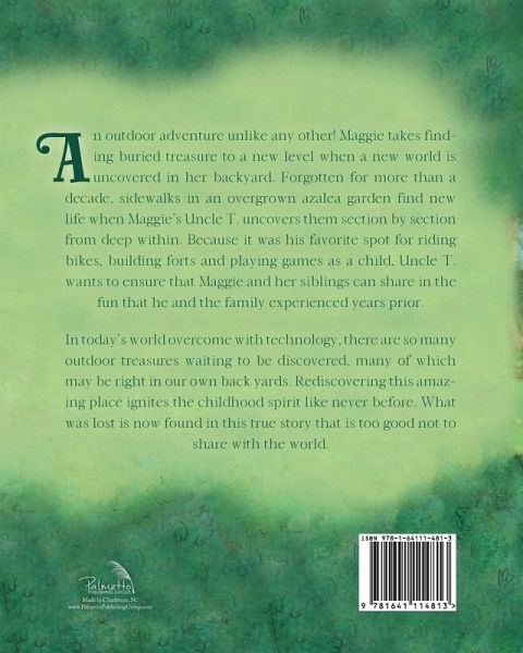An outdoor adventure unlike any other! Maggie takes finding buried treasure to a different level when a new world is uncovered in her backyard. Forgotten for more than a decade, sidewalks in an overgrown azalea garden find new life when Maggie’s Uncle T. uncovers them section by section. Uncle T. wants Maggie and her siblings to share in the fun he experienced as a child on the garden sidewalks, which were his favorite spot for riding bikes, building forts, and playing games. In today’s world overcome with technology there are many outdoor treasures waiting to be discovered, some of which may be in our own backyards. Rediscovering this amazing place ignites the childhood spirit. What was lost is now found in this true story that is too good not to share with the world.¿