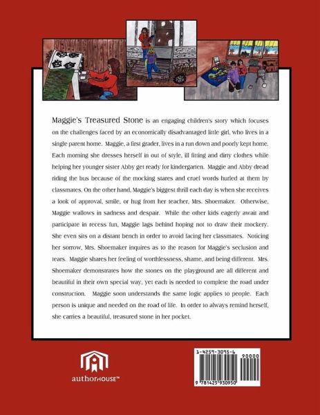 Maggie's Treasured Stone is an engaging children's story which focuses on the challenges faced by an economically disadvantaged little girl, who lives in a single parent home. Maggie, a first grader, lives in a run down and poorly kept home. Each morning she dresses herself in out of style, ill fitting and dirty clothes while helping her younger sister Abby get ready for kindergarten. Maggie and Abby dread riding the bus because of the mocking stares and cruel words hurled at them by classmates. On the other hand, Maggie's biggest thrill each day is when she receives a look of approval, smile, or hug from her teacher, Mrs. Shoemaker. Otherwise, Maggie wallows in sadness and despair. While the other kids eagerly await and participate in recess fun, Maggie lags behind hoping not to draw their mockery. She even sits on a distant bench in order to avoid facing her classmates. Noticing her sorrow, Mrs. Shoemaker inquires as to the reason for Maggie's seclusion and tears. Maggie shares her feeling of worthlessness, shame, and being different. Mrs. Shoemaker demonstrates how the stones on the playground are all different and beautiful in their own special way, yet each is needed to complete the road under construction. Maggie soon understands the same logic applies to people. Each person is unique and needed on the road of life. In order to always remind herself, she carries a beautiful, treasured stone in her pocket.
