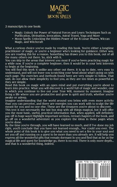 If you have wondered what is missing from your life or why events don't seem to go your way, keep on reading... Two manuscripts in one book:Magic: Unlock the Power of Natural Forces and Learn Techniques Such as Purification, Divination, Invocation, Astral Travel, Yoga and More Moon Spells: Unlocking the Hidden Power of the 8 Lunar Phases, Wiccan Magic, and Witchcraft Do you ever wonder how to connect with worlds beyond what you can see, hear, smell, taste, and touch? Have you been practicing magic but are looking for ways to deepen your practice? Or perhaps you've thought about taking up the practice, but you're overwhelmed by the information out there? If so, then you've come to the right place. Part one of this book will give you the building blocks you need to begin your magic practice. You will:Learn what your True Will is... And what it isn't. Unlock the wonderful powers of your mind through potent meditation techniques. Discover the magic that lies within your physical body and how you can use it to thrive. Learn how to 10X your magical practices by setting up your own sacred space- no matter where you are! Get a comprehensive list of magical tools you'll need for your rituals. Discover all you need to know about getting prepared to enter a magical state of mind for maximum results. Learn 5 meditation techniques to help you unlock the forces of nature. Discover techniques to perform astral projection and astral travel. Discover the easiest, fastest, and yet most effective purification method. Become aware of the pitfalls that make your rituals backfire or render them ineffective. Discover the wonderful practice of divination to gain insight into any issue you want! Uncover the secrets to invocation and how to make it work for you. And so much more! In part two of this book, we will uncover the secrets of Moon Spells and how you can use them to change your life for the better. We will show you how to practice rituals and cast spells to attract good fortune, plus protecting yourself and your loved ones from the negative energies in the world. You will discover:The Moon deities and their significance and symbolism across ancient civilizations. The lunar phases and the significance of each phase. The best spells to cast during each one of the eight lunar phases. The tools you will need to cast spells and perform magical rituals. Love spells to help you find the perfect partner. Spells to increase fertility and to facilitate safe childbirth. Money and wealth spells to help you get a new job or a great promotion at work. Protection spells to eliminate negative energy in your life. How to create your own moon ritual. How to honor the moon deities and the ceremonies passed down across generations. If you want to learn more about magical mastery and moon spells, then scroll up and click the "add to cart" button.