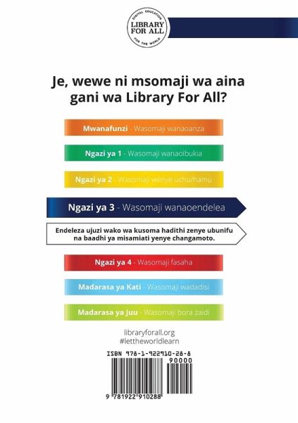 Two parents discover their child drinking animal milk and leave it alone. The child crawls into a cow and is discovered by a poacher. Wazazi wawili wanagundua mtoto wao anakunywa maziwa ya wanyama na kuyaacha peke yake. Mtoto anaingia ndani ya ng'ombe na kugunduliwa na jangili. Your purchase of this book supports Library For All in its mission to make knowledge available to all, equally.